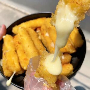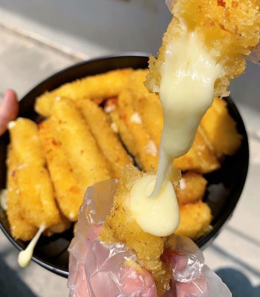 Những cây phô mai que được bao bọc bên ngoài với một lớp bột mềm mại đem chiên xù thơm giòn, cắn một miếng thôi là đã đủ để cảm nhận vị béo ngậy. Món ăn này chấm kèm với tương ớt nữa là ngon hết sảy. Không hổ danh là “món ăn gây nghiện” chỉ cần thử một lần là ghiền ngay lập tức.